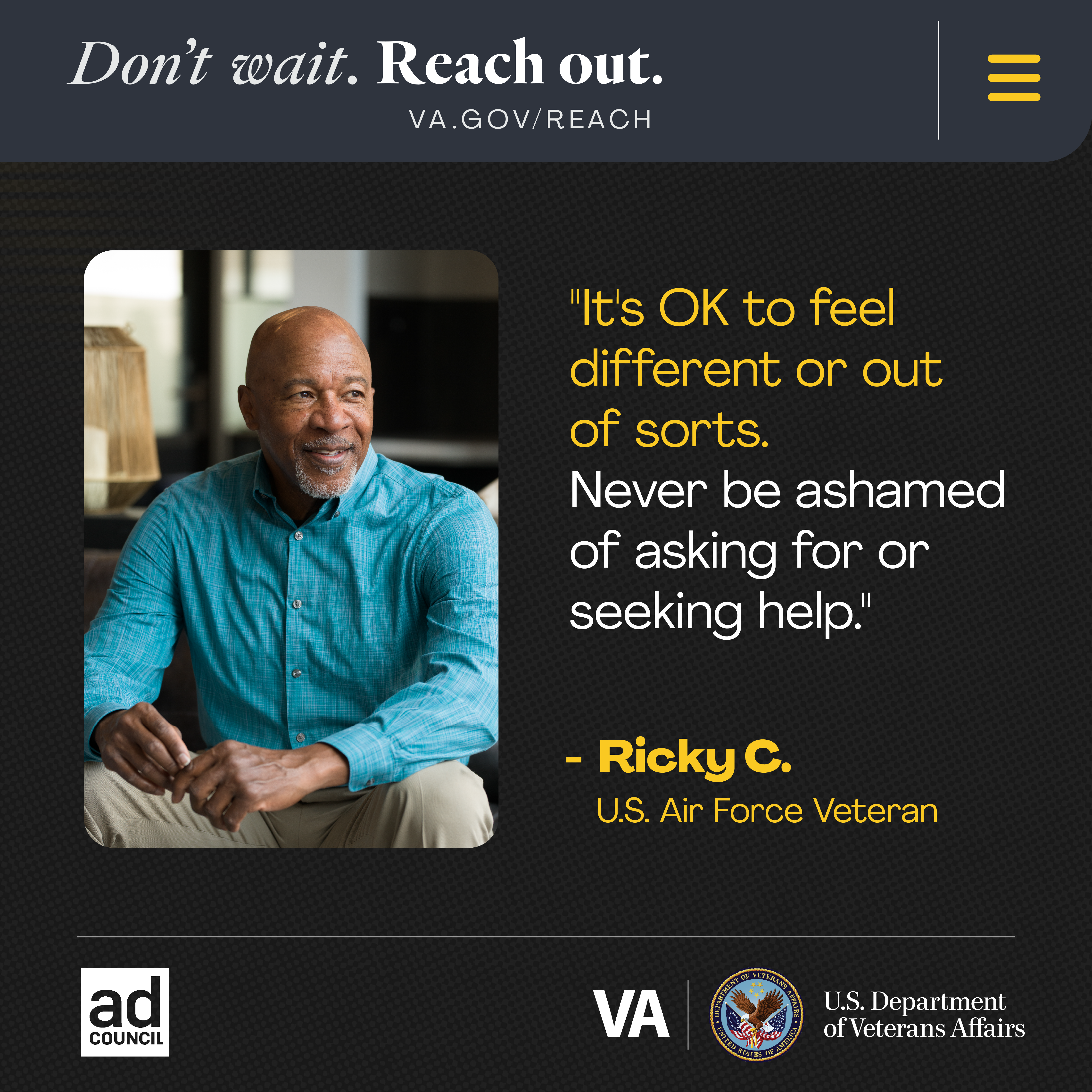 Veterans, never be ashamed of asking for or seeking help. Find resources at VA.gov/REACH. #VetsReachOut